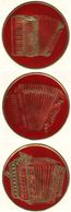 Gold-embossed round red seals with piano accordion, Slovenian / Austrian button box, and Cajun accordion.