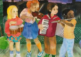Multi-color birthday card with envelope featuring original art by Vera Williams, author & illustrator of "MUSIC, MUSIC FOR EVERYONE".
