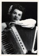 Post card with black & white photograph of a woman with her accordion. The woman is the late Harriet Okun Rose Shady, who began playing accordion professionally in the late 1930s as a young girl in Washington, DC.