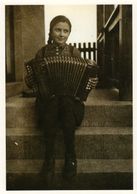 Post card with black & white photograph of a girl playing the accordion. The photograph was taken in 1939, and the girl is Loni Kuehr, mother of the late Walter Kuehr, accordionist, composer, orchestra leader, and owner of the Main Squeeze accordion shop in New York City.